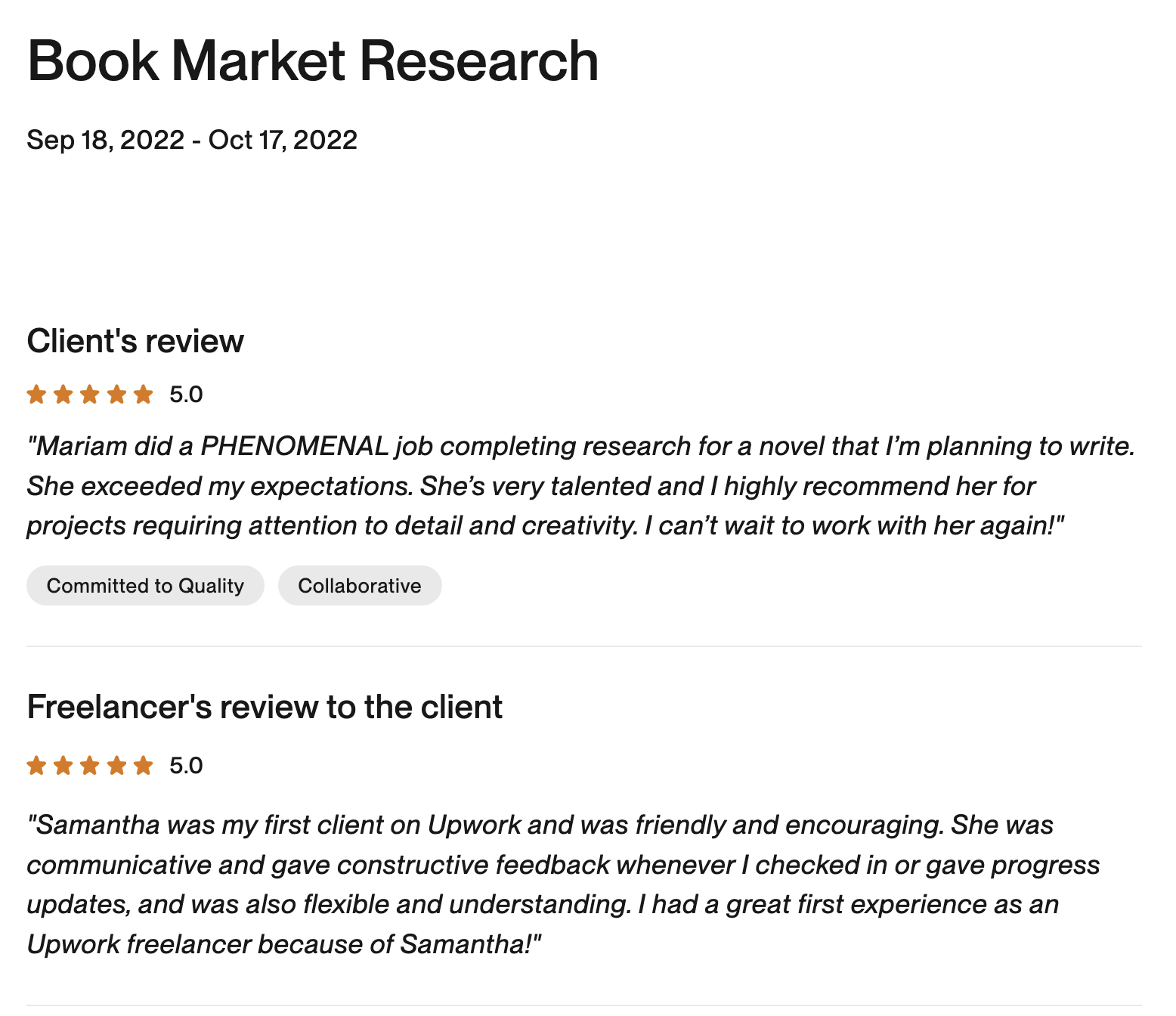 Reviews from my freelance research clients